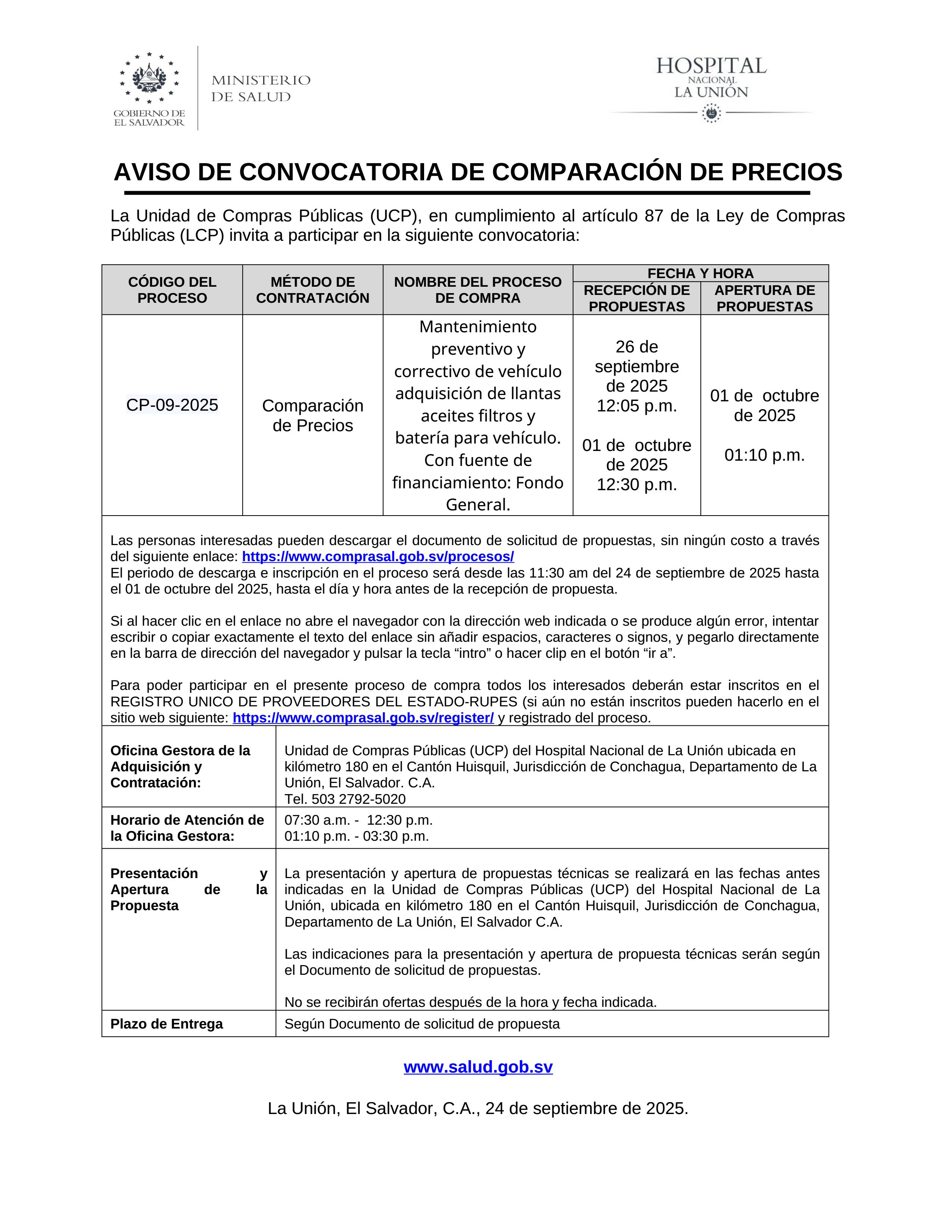 COMPARACIÓN DE PRECIOS | "MANTENIMIENTO PREVENTIVO Y CORRECTIVO DE VEHÍCULO ADQUISICIÓN DE LLANTAS ACEITES FILTROS Y BATERÍA PARA VEHÍCULO" Fuente de Financiamiento: FONDO GENERAL |