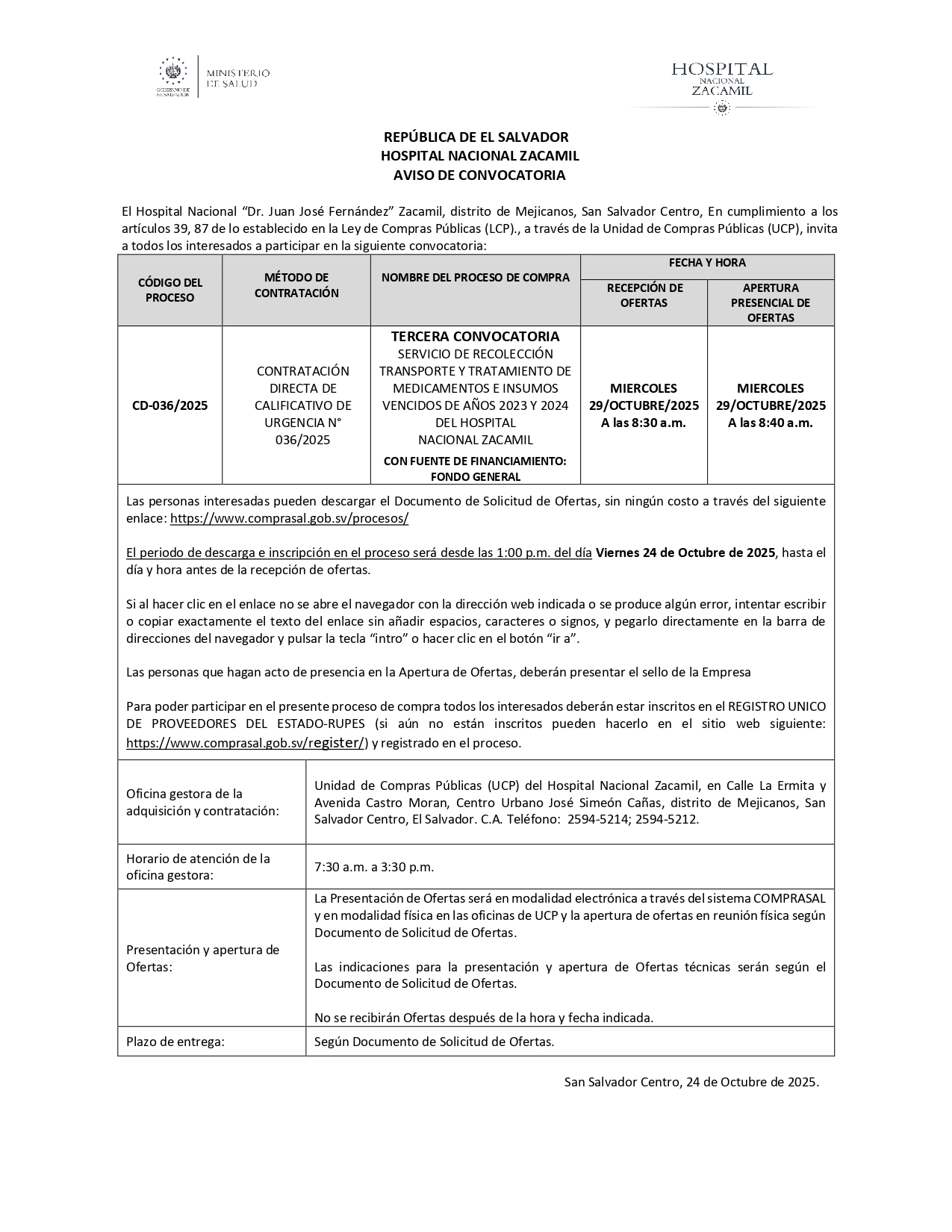 CONTRATACIÓN DIRECTA POR CALIFICATIVO DE URGENCIA | "TERCERA CONVOCATORIA SERVICIO DE RECOLECCIÓN TRANSPORTE Y TRATAMIENTO DE MEDICAMENTOS E INSUMOS VENCIDOS DE AÑOS 2023 Y 2024 DEL HOSPITAL NACIONAL ZACAMIL" Fuente de Financiamiento: FONDO GENERAL |