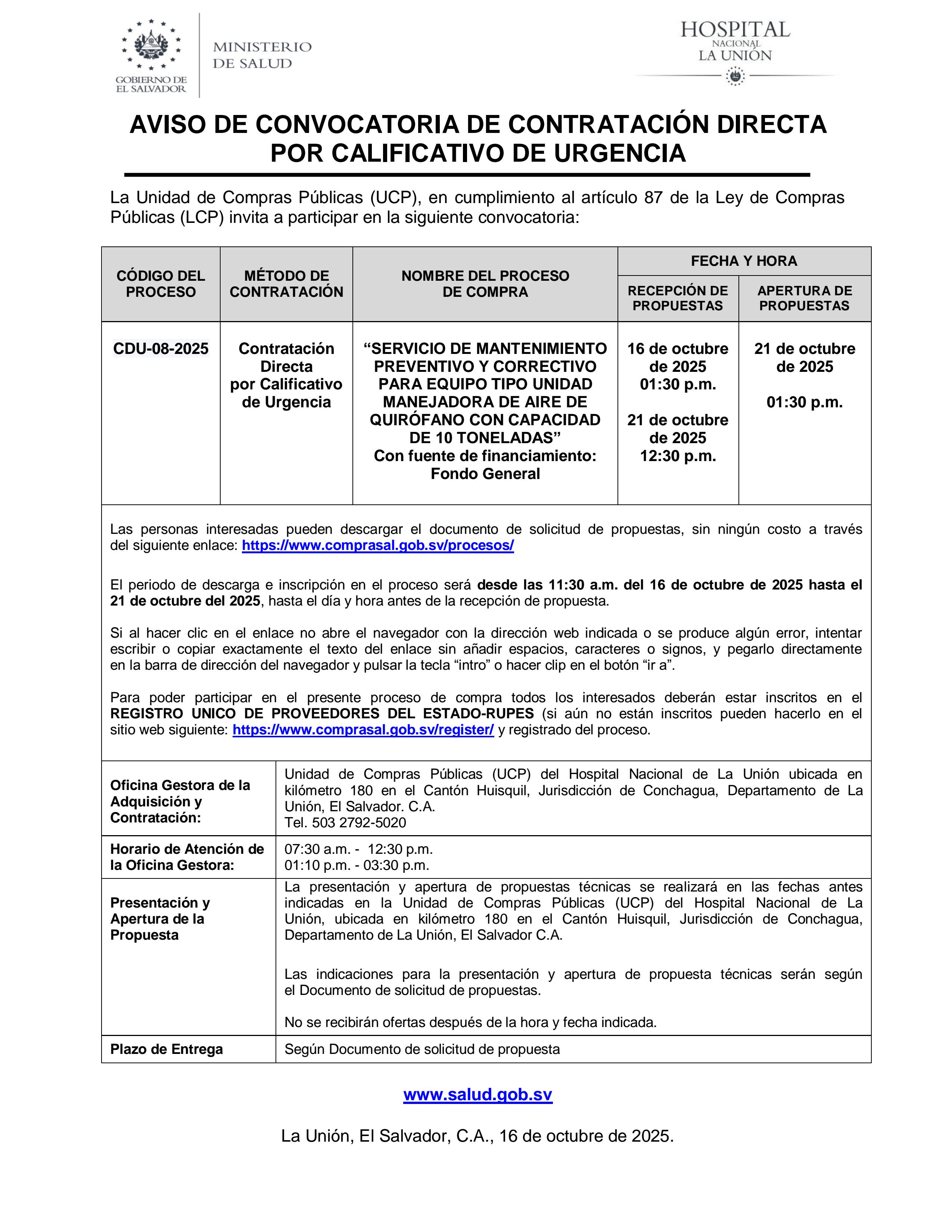 CONTRATACIÓN DIRECTA POR CALIFICATIVO DE URGENCIA | "SERVICIO DE MANTENIMIENTO PREVENTIVO Y CORRECTIVO PARA EQUIPO TIPO UNIDAD MANEJADORA DE AIRE DE QUIRÓFANO CON CAPACIDAD DE 10 TONELADAS" Fuente de Financiamiento: FONDO GENERAL |