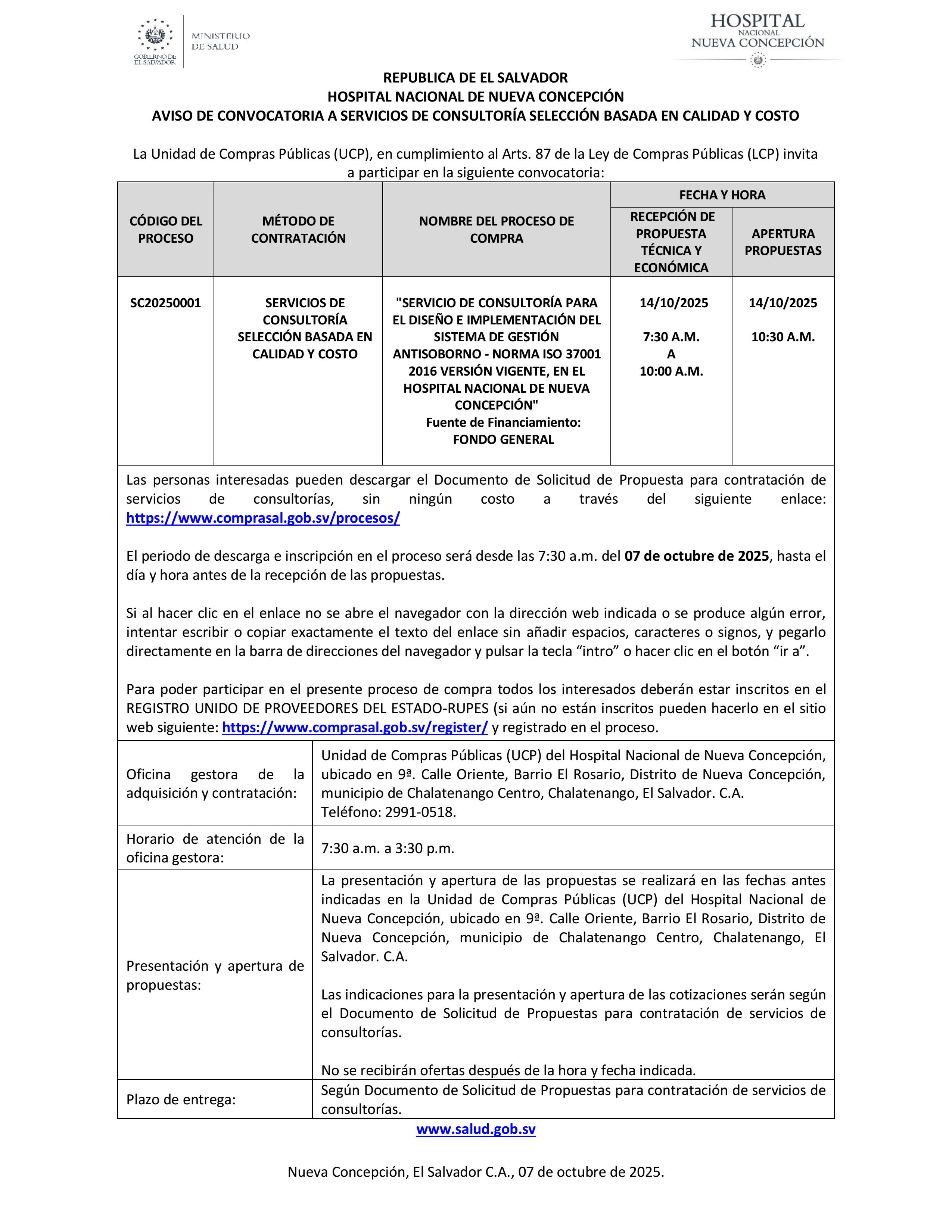 SERVICIOS DE CONSULTORÍA SELECCIÓN BASADA EN CALIDAD Y COSTO | "SERVICIO DE CONSULTORÍA PARA EL DISEÑO E IMPLEMENTACIÓN DEL SISTEMA DE GESTIÓN ANTISOBORNO - NORMA ISO 37001 2016 VERSIÓN VIGENTE, EN EL HOSPITAL NACIONAL DE NUEVA CONCEPCIÓN" Fuente de Financiamiento: FONDO GENERAL |