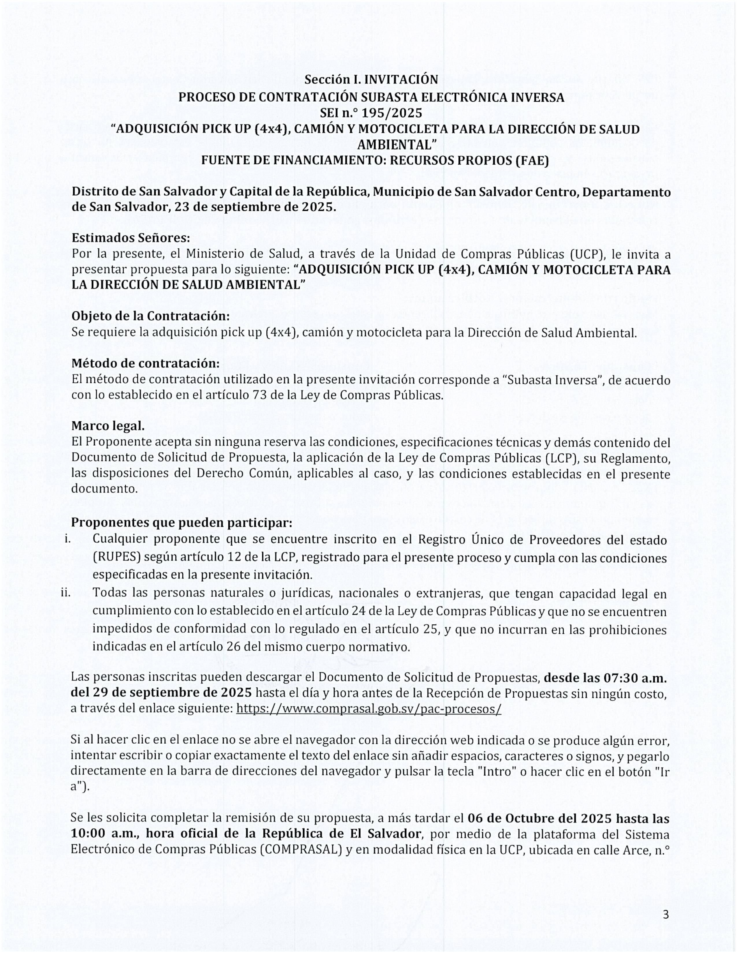 "ADQUISICIÓN PICK UP (4x4), CAMIÓN Y MOTOCICLETA PARA LA DIRECCIÓN DE SALUD AMBIENTAL" Fuente de Financiamiento: Recursos Propios (FAE) |