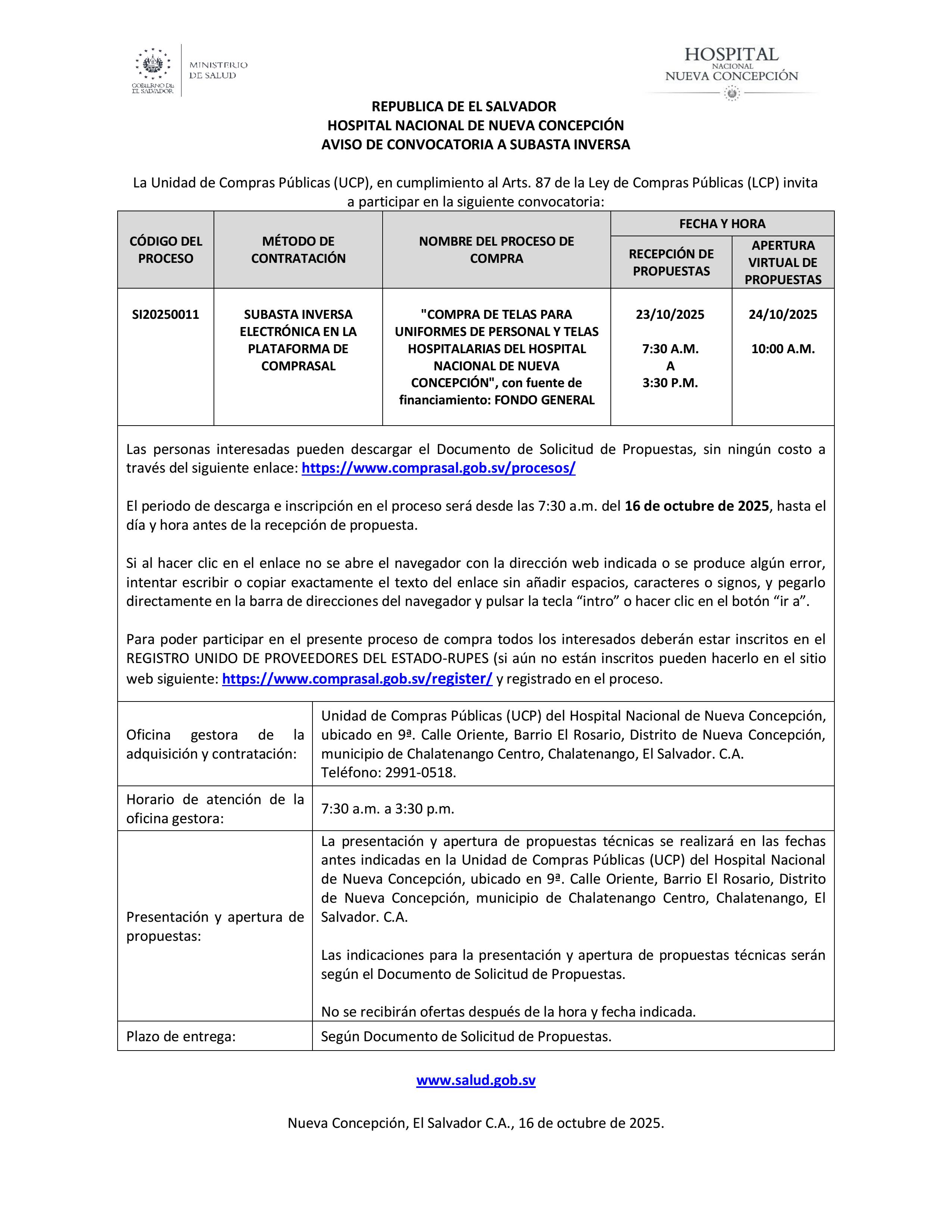 SUBASTA INVERSA ELECTRÓNICA EN LA PLATAFORMA DE COMPRASAL | "COMPRA DE TELAS PARA UNIFORMES DE PERSONAL Y TELAS HOSPITALARIAS DEL HOSPITAL NACIONAL DE NUEVA CONCEPCIÓN" Fuente de Financiamiento: FONDO GENERAL |